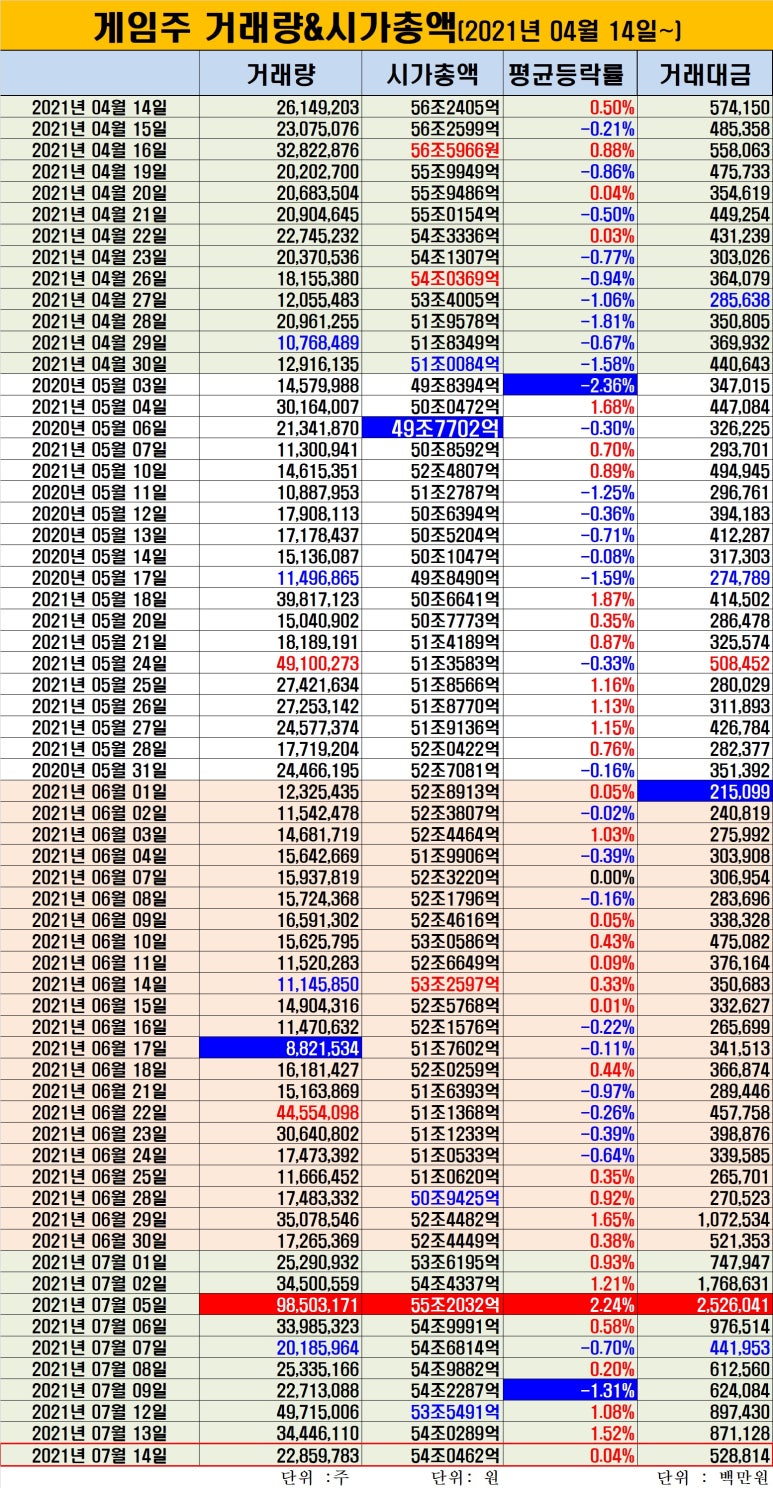 게임주는 평균등락률 +0.04%로 3거래일째 플러스를 이었다. 전체 거래량과 대금은 감소했다. 시가총액은 전일보다 소폭 증가했다. 54조462억원으로 전일보다 173억원이 증가한 것.