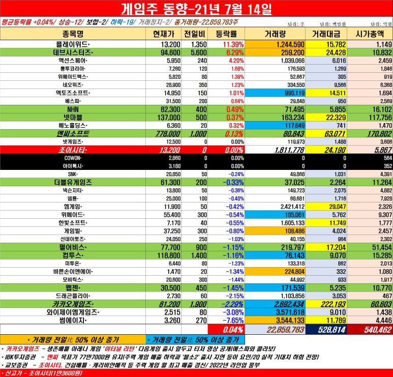 [게임주식-7월 14일]평균등락률 +0.04%, 하락 종목 19개로 급증·플레이위드 급등…투톱 엔씨·넷마블 강보합, 전체 시총 소폭 상승