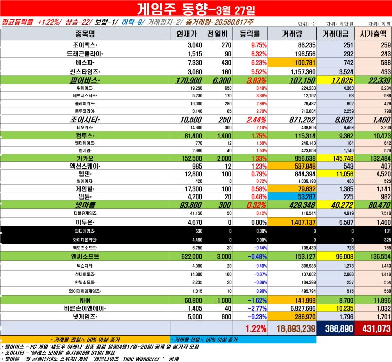 [게임주 동향-3월 27일]평균등락률 +1.22%, 4거래일째 우상향…일부 대형주 반등, 전체 시총 43조원 회복
