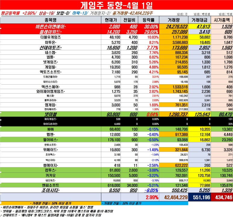 [게임주 동향-4월 1일]평균등락률 +2.99%, 거래량·대금 폭증…바른손이앤에이·플레이위드 상한가
