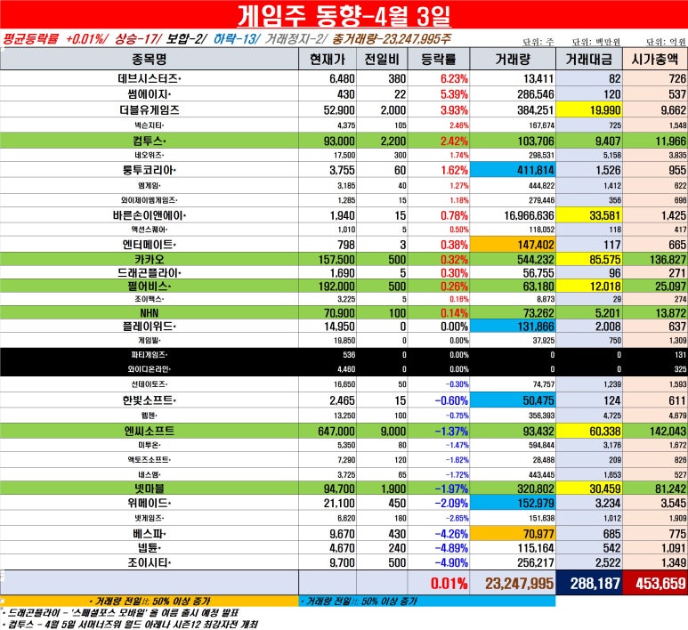 [게임주 동향-4월 3일] 평균등락률 +0.01%, 9거래일 연속상승…전체 거래량·대금·시가총액 모두 감소